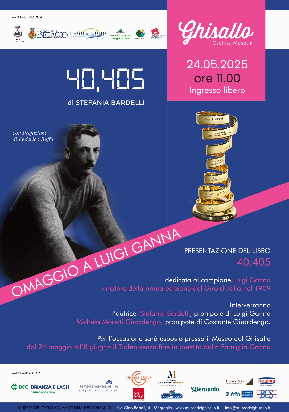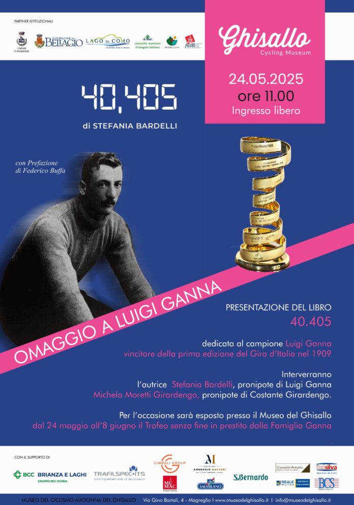 Sabato 24 maggio alle ore 11.00, il Museo del Ghisallo ospita un incontro speciale con la storia di Luigi Ganna, il primo vincitore del Giro d’Italia. Un’occasione per ripercorrere la vita e le imprese del campione varesino, protagonista indiscusso del ciclismo eroico: tutto Ganna verrà raccontato con la presentazione del libro dedicato alla sua storia, firmato da Stefania Bardelli, pronipote del re del fango. All’incontro partecipa la Asd Ganna, storica squadra fondata da Ganna nel 1913 e attiva fino al 1953, rifondata a inizio 2025 grazie all’impegno del presidente Andrea Stocco. E ci sarà anche il professionista Giacomo Nizzolo e la pronipote di Costante Girardengo, Michela Moretti Girardengo.
