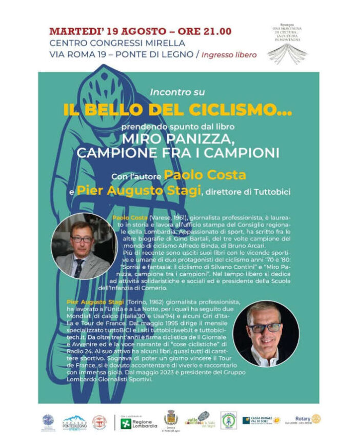 Questa sera al Centro Congressi Mirella di Ponte di Legno si parlerà di ciclismo a partire dal libro Miro Panizza, campione fra i campioni,(Macchione, 232 pagine, 20 euro), scritto da Paolo Costa. Oltre all’autore del testo dedicato al corridore di Fagnano Olona, è stato invitato a parlare anche Pier Augusto Stagi. L’inizio è alle ore 21.