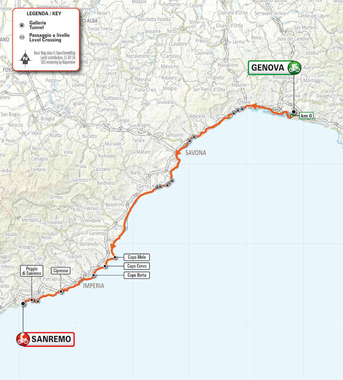 Confermata Genova come sede di partenza, la corsa si chiuderà a Sanremo in Via Roma dopo 156 km. Immutato il finale, con il passaggio in sequenza dei tre Capi, della Cipressa e dell’ascesa al Poggio, con scollinamento a 5.5 km dal traguardo.