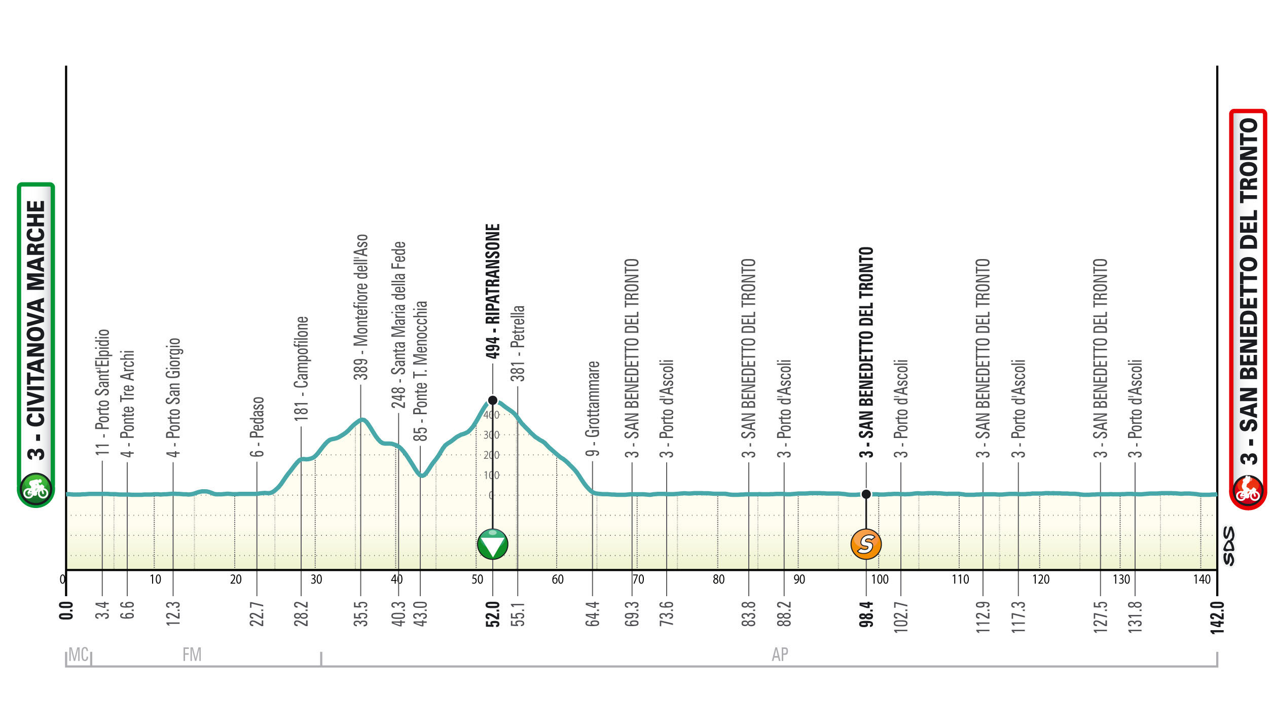 San Benedetto del Tronto accoglierà oggi il vincitore della Tirreno-Adriatico. La frazione è adatta ai velocisti. Tappa poco mossa nella prima parte e assolutamente piatta negli ultimi 80 km. Partenza lungo l’Adriatico per entrare lungo la valle dell’Aso da Pedaso e salire a Montefiore d’Aso e dopo una breve discesa si raggiunge con l’ultima facile salita Ripatransone. Lunga discesa fino a Grottammare prima di entrare nel circuito di circa 15 km da ripetere 5 volte. Percorso del circuito prevalentemente su strade rettilinee, larghe e asfaltate. Ultimi 3 km su strade ampie e prevalentemente rettilinee alcune semicurve su strade di media larghezza nella prima parte. Ultima doppia curva a circa 1km dall’arrivo.