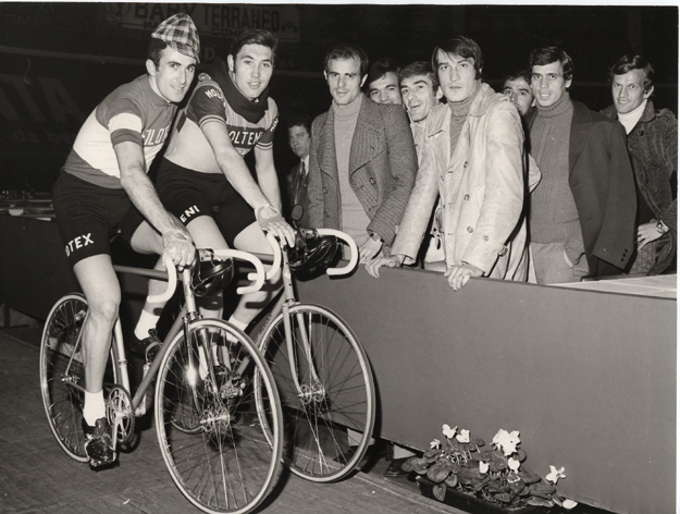Bitossi e Merckx alla Sei Giorni di Milano. Fra il pubblico i giocatori del Milan